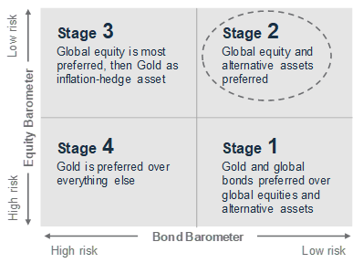 Probability of the evolution of financial market risk cycle from the current Stage 2 and preferred assets