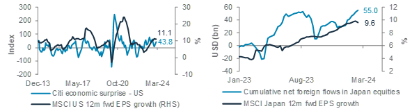 Citi US economic surprise vs. MSCI US 12m forward EPS growth (left-hand chart); Cumulative net foreign flows into Japan equities vs. MSCI Japan 12m forward EPS growth