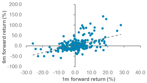 - Momentum is instead a better guide to how much higher stocks can run in the coming months. Onshore Chinese stocks have shown a tendency to produce even greater returns whenever short-term returns exceed 10%.