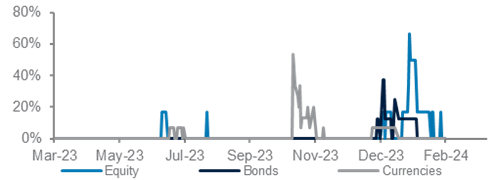 Market diversity remains high in most currency markets. USDCHF is the only currency where our market indicator recently flagged a reversal signal in January. CHF has depreciated against the USD by 5.0% after it reached an 8-year high at the beginning of this year. Looking more broadly, the weakness in CHF against the dollar was partly due to USD strength as the USD index (DXY) has rebounded since December 2023 as Fed rate cut expectations were pushed back to June 2024.