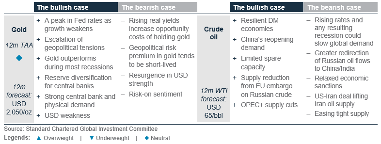 We moderate our bullish views on gold, downgrading it to Neutral versus other major asset classes, with a 12-month forecast of USD 2,050. Upward revisions to our forecasts of 10-year bond yields and the USD, which are negatively correlated to gold, lead us to see smaller upside for gold from here. Furthermore, hedging demand is likely to be lower with the suspension of the US debt-ceiling. With that said, we still see a place for the yellow metal as a portfolio ballast within a diversified allocation. Gold has historically outperformed in recessions, and it has displayed safe-haven properties during times of crisis. These features increase the appeal of gold as a hedge against a backdrop of elevated macro uncertainty, especially with the current low investor allocation. Continued demand from central banks, households and investors are other key drivers behind our constructive view.