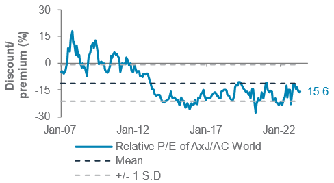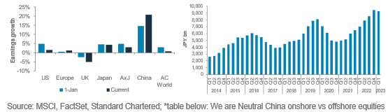 We see value in the two China sectors we consider a Buy. Communication services is dominated by media and entertainment companies that we believe will benefit from greater consumer spending and policy support for internet firms. Earnings revision in the sector has rebounded strongly. We also see Consumer discretionary as a beneficiary of the ongoing recovery and policymakers’ priority in boosting domestic consumption. The recovery is likely to gather pace in H2 23 as job markets recover and income growth steps up.