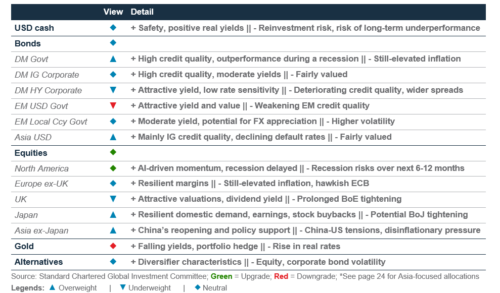 Meanwhile, we close our earlier Underweight in equities and upgrade the asset class to a core allocation. In our view, an Overweight view on Developed Market (DM) IG government bonds and a core allocation to global equities allow us to balance strong equity momentum today against the delayed, but still real, US recession risk.