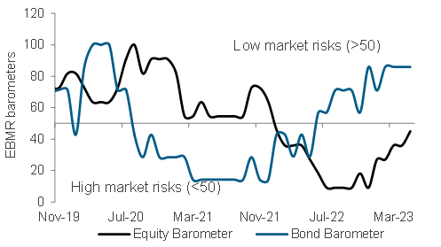 Our US Equity-Bond Market Risk (EBMR) models the downside risks in US equities and the 10-year US government bonds. It uses 11 economic and market factors to create equity and bond risk barometers. If the value of a barometer falls below 50, it signals higher downside risks and vice versa.