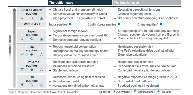 We upgrade Technology to Overweight. The semiconductor segment accounts for over 50% of the sector and is expected to benefit from AI investments, driving strong earnings growth up to 2025. Consumer discretionary is upgraded to Overweight. Luxury goods continue to drive sector earnings and autos exceeded expectations in Q1 23 results. We view the sector as a play on China’s reopening. Financials is upgraded to Overweight as more interest rate hikes drive strong earnings growth and valuation remains attractive.
