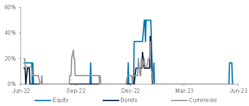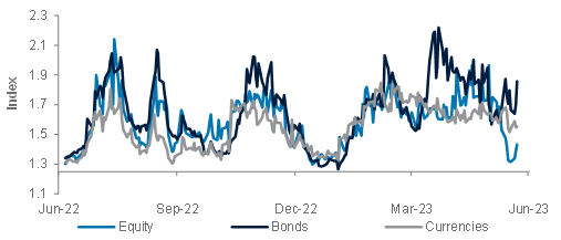 Market diversity across equity, bond and currency markets has started to trend lower this month, albeit it has been more volatile for bond markets. The biggest shift has been in equities as their average diversity declined sharply to 1.43 currently from 1.75 at the start of the month. Meanwhile, diversity of currencies remains high despite trending lower.