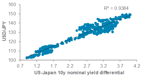 USD/JPY and differential between 10-year US and Japan government bond yields