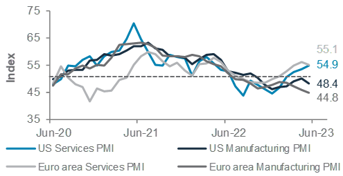 As we enter H2 2023, financial markets are presenting a challenge to investors. Equity markets have surged, at least at a headline index level, and our view is that they may rise further, at least in the short term. However, leading indicators of economic growth (particularly in the US) continue to paint a less optimistic picture and most major central banks remain much more concerned about elevated inflation than about weak growth indicators.