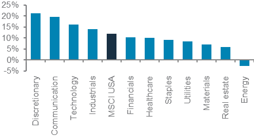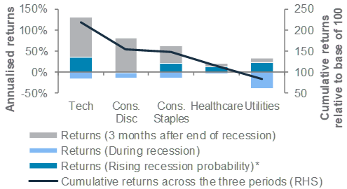 In the US, our sector preferences have turned a little more barbell-like. We view healthcare, communication services and technology as Buys. Healthcare sits at one end of the barbell, offering a relatively defensive exposure given the weaker macroeconomic backdrop. Technology and Communication services, on the other hand, offer an attractive hedge if the ongoing sector rally extends.