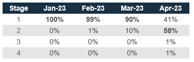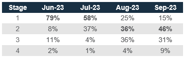 Our model projects that the US is more likely to remain in Stage 1 till July 2023. The probabilities of Stage 2 and 3, however, have been increasing due to the improvement in the equity barometer. Both stages are positive for risky assets.