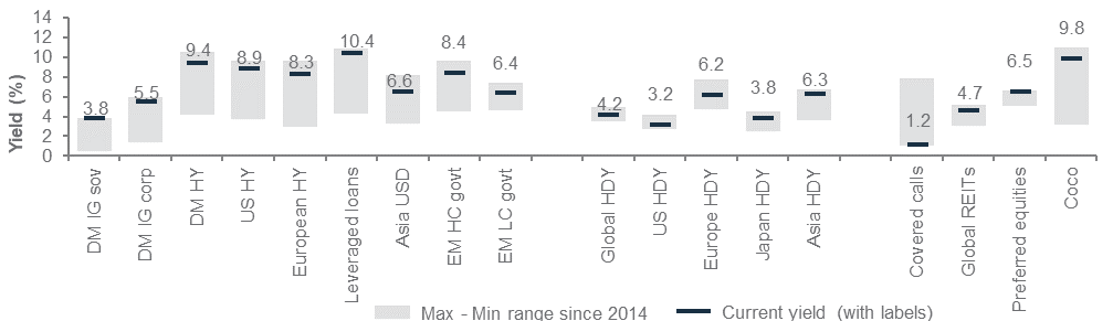 Yield to worst/dividend yield (%), yield range of various income assets since 2014