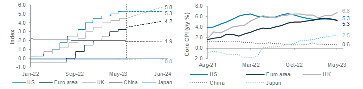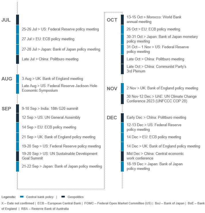 We would use opportunistic allocations in three ways in H2 2023: (i) adopt barbell-like sector strategies in the US and Euro area, while focusing on consumer-oriented sectors in China, (ii) capitalise on cross-currency opportunities amid a range-bound USD over the next 1-3 months, and (iii) look for opportunities to sell equity market volatility on spikes.