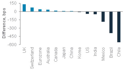 We see elevated downside risks to GBP/USD over the next 3- and 12-month horizons. While UK’s inflation remains uncomfortably high for policymakers, markets have priced in an excessive degree of rate hikes, in our view. Downside risks to UK’s economy, especially the softness in the housing market, should lead the BoE to hike less than expected. This could lead to a decline in GBP bond yields, which combined with normalisation of elevated speculative positioning should lead GBP/USD to decline towards 1.24-1.26.