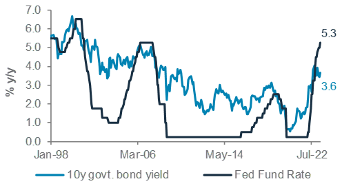 US Fed policy rate, 10y US government bond yield