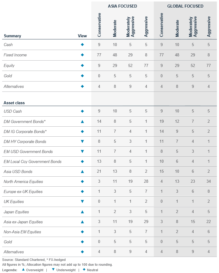 Global moderate and Asia moderate comprise our Tactical Asset Allocations as described in the Global Market Outlook publications. Broad asset class allocations are represented by MSCI AC World, FTSE Non-MBS WorldBIG Index, Bloomberg commodities ex-agriculture & livestock, HFRX total return and Bloomberg U.S. Treasury Bills: 1-3 Months Index. Equity allocations are represented by MSCI USA, EMU, UK, Japan, Asia ex-Japan and Other EM total return indices. Bond allocations are represented by FTSE WorldBig Government Index, FTSE WorldBig Corp Index, J.P. Morgan EMBI Global Diversified, EM Local, Asia Credit Index and Bloomberg Global High Yield indices.