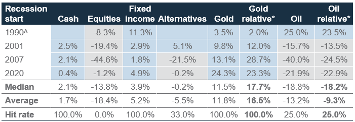 Absolute and relative performance of gold and oil during the last four recessions