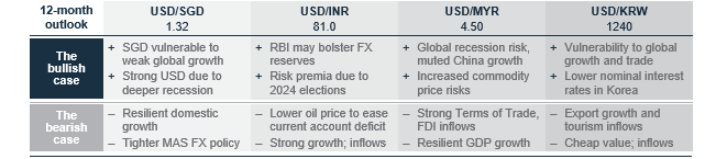 We expect USD/INR to decline modestly towards 80-81 over the next 12 months. The INR could benefit from a broad USD weakness, strong domestic growth and declining current account deficit. However, greater risk premium ahead of the 2024 elections and RBI’s rebuild of FX reserves may cap gains. USD/SGD is likely to decline modestly towards 1.30-1.32 over the next 12-months, as the MAS is likely to maintain its tightening bias on the monetary policy and SGD NEER basket benefit from EUR, MYR and CNH appreciation.