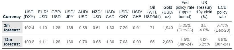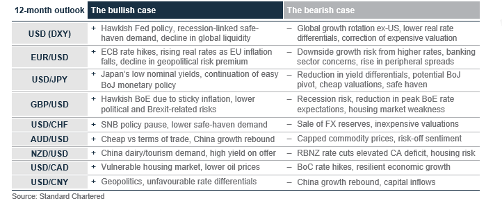 We expect the USD to be rangebound over the next three months before resuming its decline on a 12-month horizon. The Fed’s recent guidance towards a higher terminal Fed Funds rate due to a resilient labour market and sticky inflation will likely keep the 2-year US government bond yield elevated. This means the USD will remain rangebound over the next three months owing to the interest rate advantage over other major currencies. Additionally, the decline in US and global liquidity, due to a combination of ongoing reduction in central bank balance sheets and the US Treasury refilling cash reserves, is also supportive for the USD. However, we still see a high likelihood of a US recession over the next 12 months. Hence, we expect the Fed to start cutting interest rates sooner than its current guidance. As markets price Fed rate cuts in advance, we expect 2- and 10-year US government bond yields to decline substantially over the next 12 months, leading to narrower interest rate differentials and pushing the USD lower. Persistent US inflation or a sharper-than-expected US growth slowdown are key risks to our bearish USD view as they may spark safe-haven demand leading to USD resilience, or even USD strength.