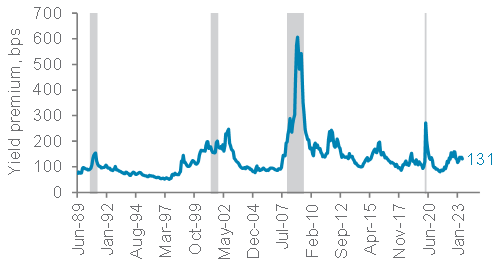 We have added to DM HY bonds, despite expectations of a likely recession over the next 12 months. Credit spreads are largely in line with historical averages but the risk of higher spread is compensated by current high yields (over 9% yield-to-worst). If our view of a delayed US recession (see the Macro section) and any economic contraction being a mild one proves to be correct, this would suggest a rather benign outlook on default risks and credit spreads. In our assessment, spreads on DM HY bonds will need to expand by as much as 250bps before total returns become negative, assuming a mild default scenario of c. 2-3%. As such, it may be attractive for investors to consider clipping coupon from HY bonds, while maintaining a vigilant eye on any worsening of fundamentals and credit risk.