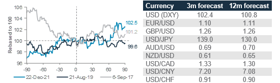 Although we expect further upside in the EUR on the back of the ECB’s hawkish guidance, we lower our 12-month forecast as renewed hawkishness from the Fed, the RBA and the BoC means that interest rate differentials for the EUR may narrow less than previously expected. GBP/USD is likely to decline over the next three months as we believe markets have overpriced the number of BoE rate hikes, and a recalibration lower could weigh on the pair. Improvement in China’s growth expectations should lead to modest appreciation for the CNH and commodity currencies – the AUD, the NZD and the CAD.