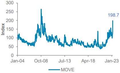 - US and European government bonds have both delivered as safe-haven assets over the past week, significantly outperforming equities, as yields plummeted. The US government bond market volatility index (MOVE) has soared to its highest level since the 2008 Global Financial Crisis. High-quality bonds remain our preferred asset as a source of income and a short-term volatility hedge. Bond yields are likely to rebound if central bank efforts to support bank liquidity alleviate investor concerns. We would add exposure to high quality bonds and a broader basket of income assets on any rebound in yields.