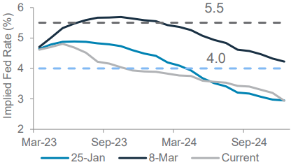 The two US bank failures late last week and the crisis at Credit Suisse this week have turned the focus back to financial stability. Hence, we now expect the ECB to hike by only 25bps tonight, instead of a 50bps signalled by ECB President Lagarde as recently as last week. We also see a 60% probability of a 25bps Fed rate hike on 22 March, and a 25% chance the Fed pauses. This compares with market expectations of a 50bps Fed rate hike just last week, after Chair Powell’s testimony to the US Congress. Post-meeting guidance from Lagarde and Powell will be watched to assess the extent to which financial stability issues will influence the policy stance going forward.