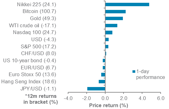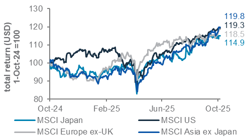 However, Japan was suffering from stagnation during that period and inflation was persistently low. That justified an aggressive easing of monetary policy. The current environment is the opposite – economic growth has been picking up and inflation is already above the BoJ’s target. Japan is the only major Developed Market where its central bank is likely to tighten monetary policy. Therefore, while Takaichi’s win is a positive for equities, we are not likely to see a repeat of the ‘Abenomics’ stock market performance. We expect equity markets in the US, driven by AI-driven earnings growth, and Asia ex-Japan, driven by weaker USD and attractive valuations, to outperform.