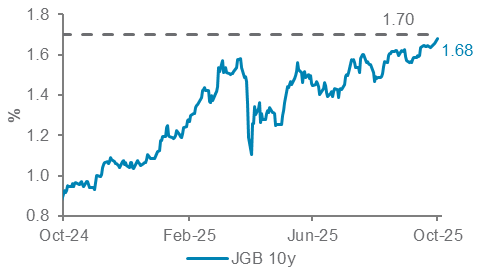 Following the election, the 10-year JGB yield climbed to 1.68-1.69%, returning to levels reached during the 2008 global financial crisis. Meanwhile, the 30-year yield surged to a record 3.3% before settling at around 3.29%. The BoJ’s yield curve control could limit excessive increases in the 10-year yield; we see near-term resistance around 1.7%. For longer maturities e.g. 30-year bond, the government may reduce supply to mitigate the impact, while the BoJ could intervene if the yield overshoots the 3.3% psychological threshold.