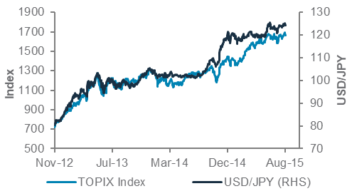 Japan’s equities have benefitted from JPY weakness caused by Abenomics policies since 2012