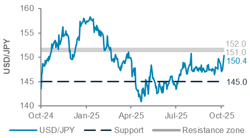 Our view: Limited short-term USD/JPY upside, with strong resistance near 151–152; likely pullback towards 145 on rate differentials.
