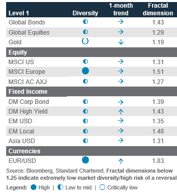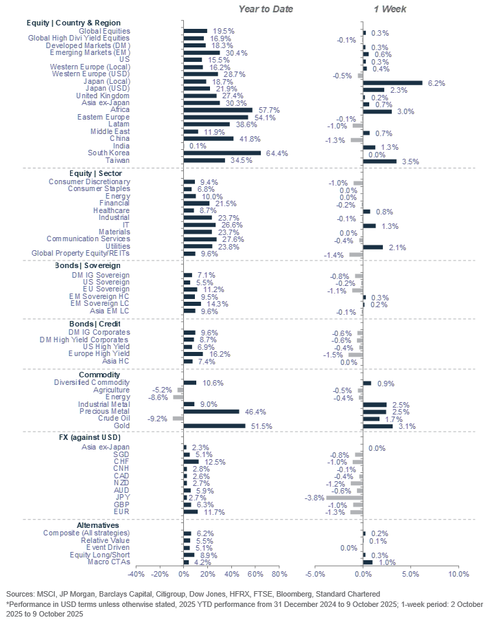 Nevertheless, this global set-up warrants a diversified allocation across asset classes and regions, with hedges. Gold, while facing a near-term road bump due to one-sided (bullish) positioning, remains a key portfolio hedge.