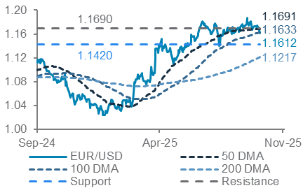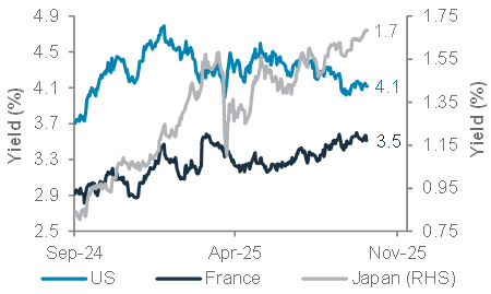 Recent U.S. labour market data indicate a gradual softening in demand, supporting further Fed cuts and limiting the scope of sustained yield increases. We expect the US 10-year government bond yield to trade within a 4.0%–4.25% range. We recommend adding long-dated USD bonds if the 10-year yield rises above 4.25%. We continue to favour the 5- to 7-year maturity bucket, which offers a good balance between yields versus fiscal and inflation considerations. Investors can consider adding French bank bonds on dips, as we see potential for recovery amid these challenges.