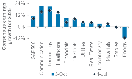 2025 consensus earnings growth by sector as of 3-Oct and 1-Jul