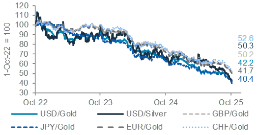 Meanwhile, the gold rally has accelerated in recent weeks, with the precious metal crossing USD 4,000/oz for the first time, amid renewed concerns about fiat currencies due to increasing dominance of fiscal policy across Developed Markets.
