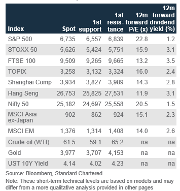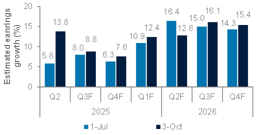 US earnings likely to deliver Against the above uncertainties, we expect another strong US earnings season, driven by the AI-driven tech sector, to ultimately offset near-term headwinds from stretched investor positioning and valuations. However, investors with excessively concentrated exposure in US equities may partially rotate into other markets, especially Asia ex-Japan, where earnings estimates are rising and valuations are attractive. To protect excessively concentrated exposures, investors can also use put options as short-term partial hedges.
