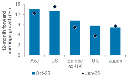 Earnings projections for Europe ex-UK equities are below Asia ex-Japan and the US