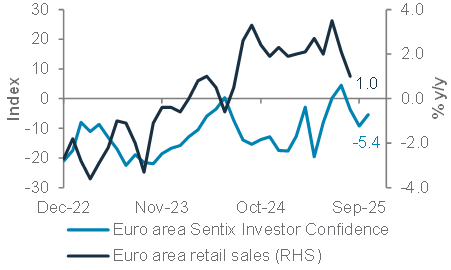 Euro area’s investor sentiment improved moderately in October, but remained negative. Retail sales rose 1% y/y, missing estimates