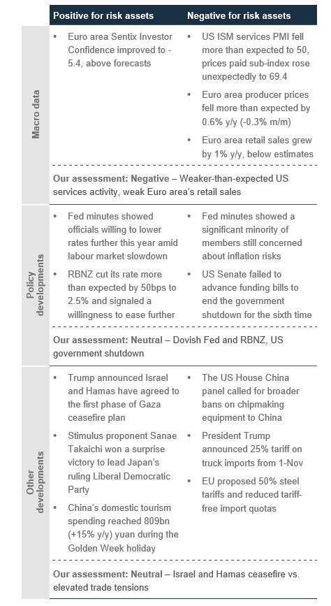 Rationale: G3 government bond yields (US, Europe, and Japan) rose over the past week amid political changes in Japan and France. In Japan, Sanae Takaichi won the LDP leadership election. She is pro-stimulus, and that may delay Bank of Japan’s rate hikes. There are concerns that this may lead to increased Japanese government bond (JGB) issuance to cover deficits. In France, Prime Minister Lecornu resigned after failing to form a cabinet and secure budget agreements in a fragmented National Assembly. The shift in sentiment also impacted US government bonds, particularly in October, which has historically been a weak-performing month, due to increased supply of long-duration bonds.