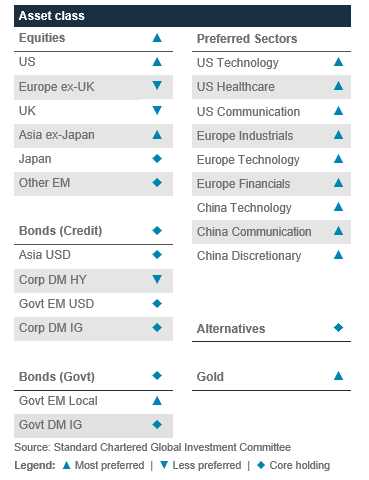 Our view: Equities – Underweight Europe ex-UK equities. Rotate into regions with higher growth opportunities, e.g. Asia ex-Japan and the US, for investors who are underallocated.