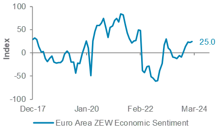 After the US inflation report, market expectations of the first Fed rate cut were pushed back to June, and the extent of the cuts expected this year has been reduced to 100bps. While recent US data has been strong, leading indicators continue to point towards slower growth over the next 6-12 months. Therefore, we retain our view that the Fed is likely to begin cutting rates from June. Also, market rate cut expectations are now more closely aligned with those of the Fed.