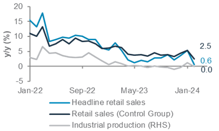 Cooler-than-expected consumption: The much softer-than-anticipated US retail sales report provided an antidote to the hot inflation report, partly calming market concerns about an overheating economy. Controlled group retail sales, a more precise measure of consumption, contracted 0.4% m/m. Some of the weakness can be ascribed to a moderation in sales following December’s holiday binge, falling goods prices and bad weather. Nevertheless, slowing consumption data supports underlying weakness in the job market, seen in the continued decline in average hours worked that we flagged last week.