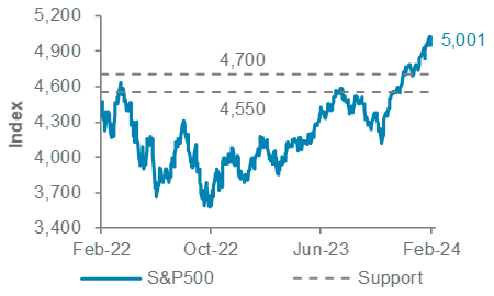We continue to see stretched investor positioning in US equities. In our view, this implies that a short-term pullback is still likely. The catalyst for such a pullback could be changes in interest rate or growth expectations. We see support for the S&P500 at around 4,700, a level where we would consider adding exposure; next support is at 4,550. We remain positive on US equities over a 6-12 month horizon, with earnings growth expected to drive the market higher. In opportunistic allocations, we would also consider allocating to our preferred sectors of technology, communication services and healthcare, where we expect strong earnings growth in 2024 to drive outperformance.