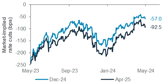While the latest data does not offer an all-clear signal as shelter inflation remains elevated, the resumption of the downward trajectory, especially in two components that had led the Q1 24 inflation resurgence (auto insurance and medical services), eased market concerns about a Fed rate hike risk. Fed Chair Powell said the latest inflation data was “a step in the right direction” towards Fed rate cuts later this year. Weaker-than-expected US retail sales in April added support to the US economic soft-landing narrative. Markets have priced about 50bps of Fed rate cuts by the end of this year (which is also our core scenario), with the first 25bps cut in September.