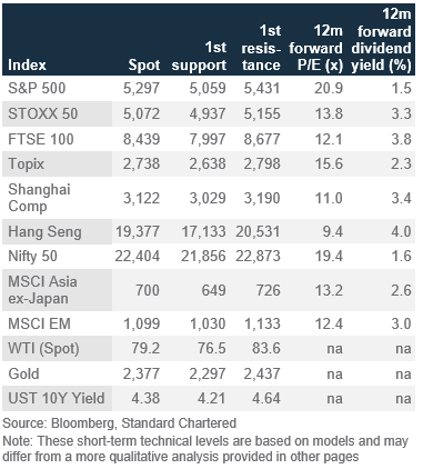 Signals from the bond market and corporate earnings: Besides economic data, US bond yields are likely to flag any change in the economic regime. On the positive side, any decisive rise in the US 2-year bond yield above the 5% level (which it has failed to sustainably break after three attempts over the past year), accompanied by a rise in equities, would likely signal a shift towards a reflationary regime (the “no landing” scenario). This would likely be positive for equities. Strong US Q1 24 corporate earnings, resulting in a rise in consensus 2024 and 2025 earnings estimates to 10.4% and 14.0% respectively, support a positive view on equities.