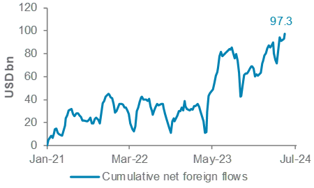 Despite the tariff announcement, we remain Neutral China equities within Asia-ex-Japan, a view we believe remains justified as tailwinds of supportive government policies and continued fund inflows is offset by longer-term economic growth concerns and property sector worries. That said, we continue to monitor any intensification of geopolitical tensions in the run-up to the US Presidential Elections in November, especially given presidential candidate Trump’s proposed tariff of 60% or higher on all Chinese goods imports.
