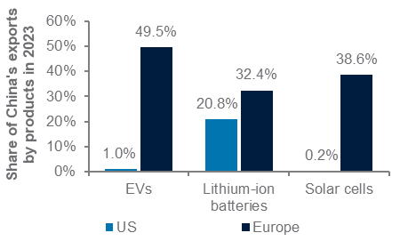 US a fairly small market for Chinese EV, Lithium-ion battery and Solar cell exports. Europe is much more significant