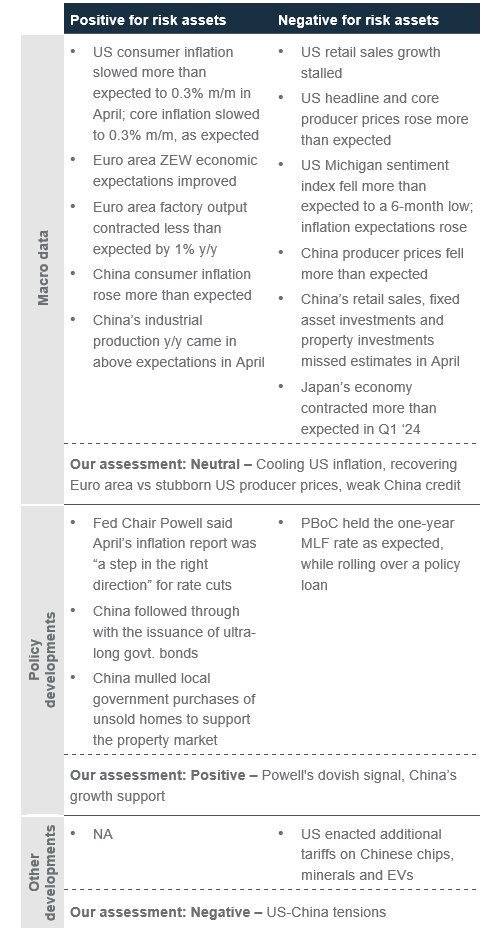 Our weekly net assessment: On balance, we see the past week’s data and policy as neutral for risk assets in the near term
