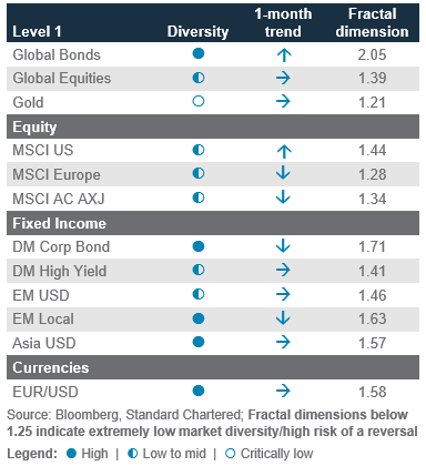 Investment implications: We see a window for the “not-too-hot, not-too-cold” Goldilocks economic regime to support risk assets in the coming months. Technical indicators remain supportive, with solid momentum and low volatility (signalling low perception of risk), especially in the US and Europe.