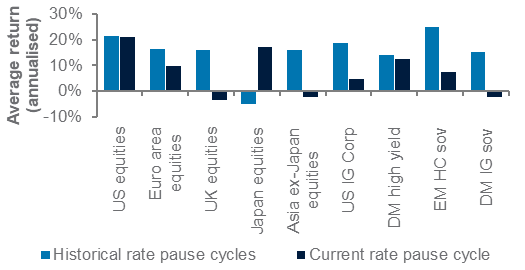 Source: Bloomberg, Standard Chartered; *relative returns (Index: 100 = 22 February, 2023); ^based on four Fed rate pauses over the past 30 years