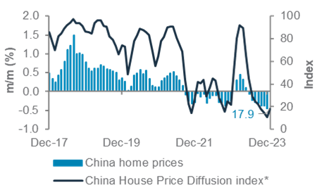 In the context of bonds, the first and second measures are more significant. China’s property developers’ USD bonds – mostly rated High Yield (HY) and likely direct beneficiaries – rallied 2.1% this week. However, while these targeted policies are positive at the margin, we believe they are insufficient to bring about a sustained price recovery for the sector’s bonds. First, housing prices continue to fall, keeping buying intentions depressed. Second, the loans can be used only for unfinished property projects. Third, the weaker developers, especially privately owned, are still likely to face difficulty accessing stable financing. By contrast, we see better opportunities in other sectors within Asia HY bonds, such as Macau gaming and India renewables sectors. Macau’s gross gaming revenue (GGR) recovery is likely to extend in 2024, while India renewables sector should continue to benefit from a positive momentum in the broader economy.